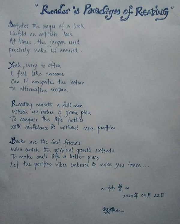 4月23日是世界读书日,为推进书香社会建设,扩大“全民阅读”的影响力,吸引全社会参与到“阅读”中来。北京交通大学国际教育学院在第25个世界读书日前夕,发起“‘阅读与美好生活’——2020 ‘世界读书日’”活动,旨在通过读经典颂名句,启迪阅读,号召全院学生参与其中,与阅读爱好者共同感受阅读氛围,激发阅读兴趣,抒发阅读情怀。